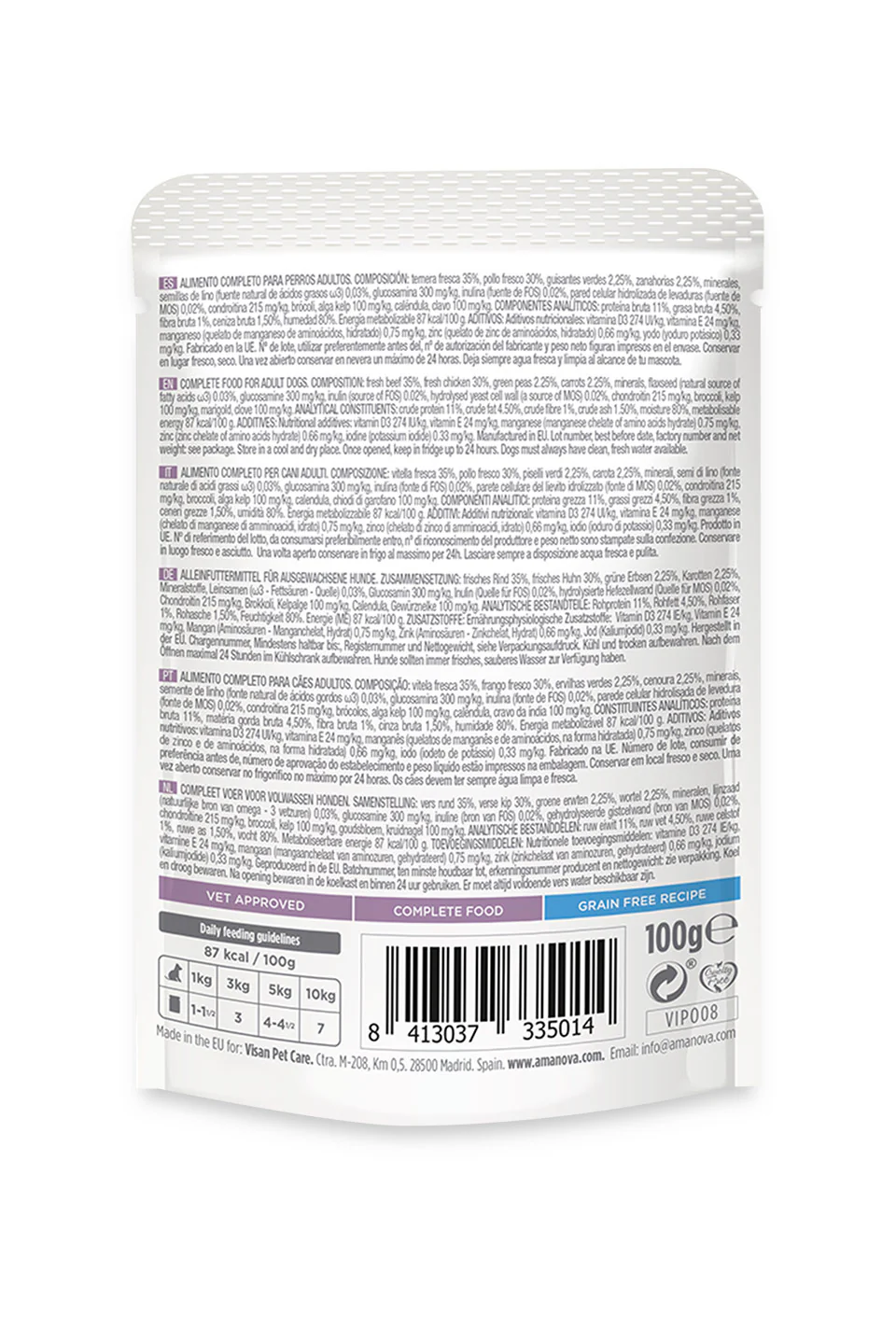 Ternera fresca 35%, pollo fresco 30%, guisantes verdes 2,25%, zanahorias 2,25%, minerales, semillas de lino (fuente natural de ácidos grasos ω3) 0,03%, glucosamina 300 mg/kg, inulina (fuente de FOS) 0,02%, pared celular hidrolizada de levaduras (fuente de MOS) 0,02%, condroitina 215 mg/kg, brócoli, alga kelp 100 mg/kg, caléndula, clavo 100 mg/kg.